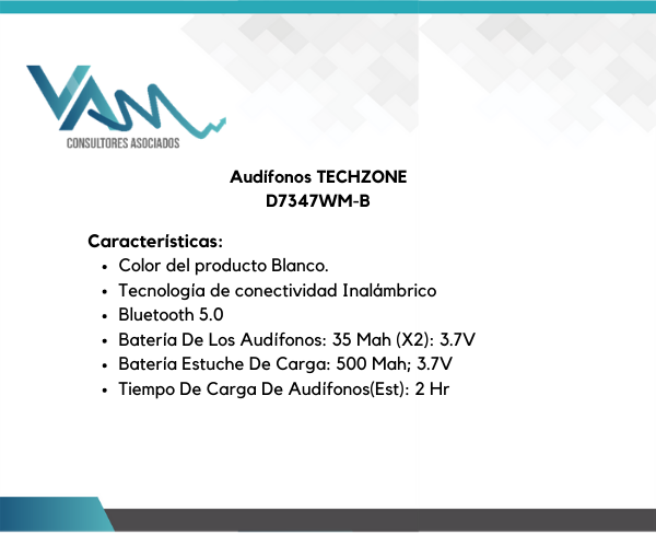 Audífono D7347WM-B Marca TECHZONE Bluetooth 5.0 Batería De Los Audífonos: 35 Mah (X2): 3.7V Batería Estuche De Carga: 500 Mah; 3.7V Alimentación De Entrada: Dc 5V/Ia Tiempo De Carga De Audífonos(Est): 2 Hr Tiempo De Carga Estuche(Est): 3 Hrs Tiempo De Reproduccion De Música: Hasta 5 Hrs En Volumen Máximo Tiempo De Uso Para Hablar: Aprox. 22 Horas Frequencia: 20 – 20 Khz