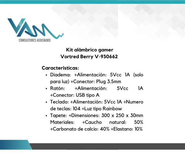Kit alámbrico gamer Vortred Berry V-930662 Diadema: +Alimentación: 5Vcc 1A (solo para luz) +Conector: Plug 3.5mm +Diámetro de driver: 50mm +Sensibilidad del Micrófono: -38 db±2 db +Impedancia: 32Ω at 1kHz Ratón: +Alimentación: 5Vcc 1A +Conector: USB tipo A +DPI: 1200 – 3600