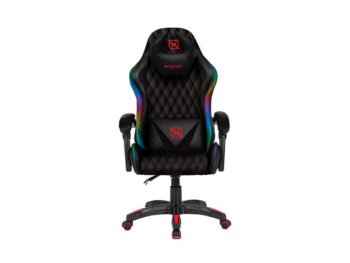 Silla Gaming NECNON Modelo NSG-RGB-1 Negro/Rojo Con bordado diamante en asiento y respaldo con material de nylon y cuero sintetico, luces LED RGB, descansabrazos linkage y piston clase 4, inclinacion de 145°, soporta un peso maximo de 150Kg